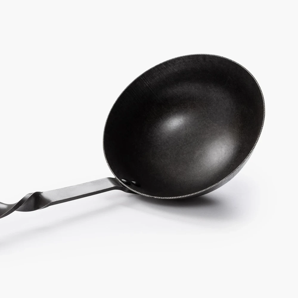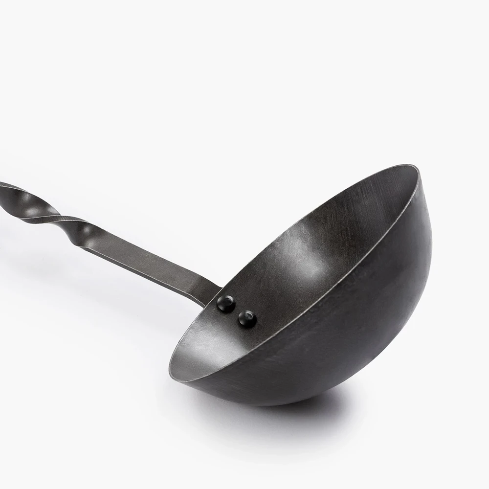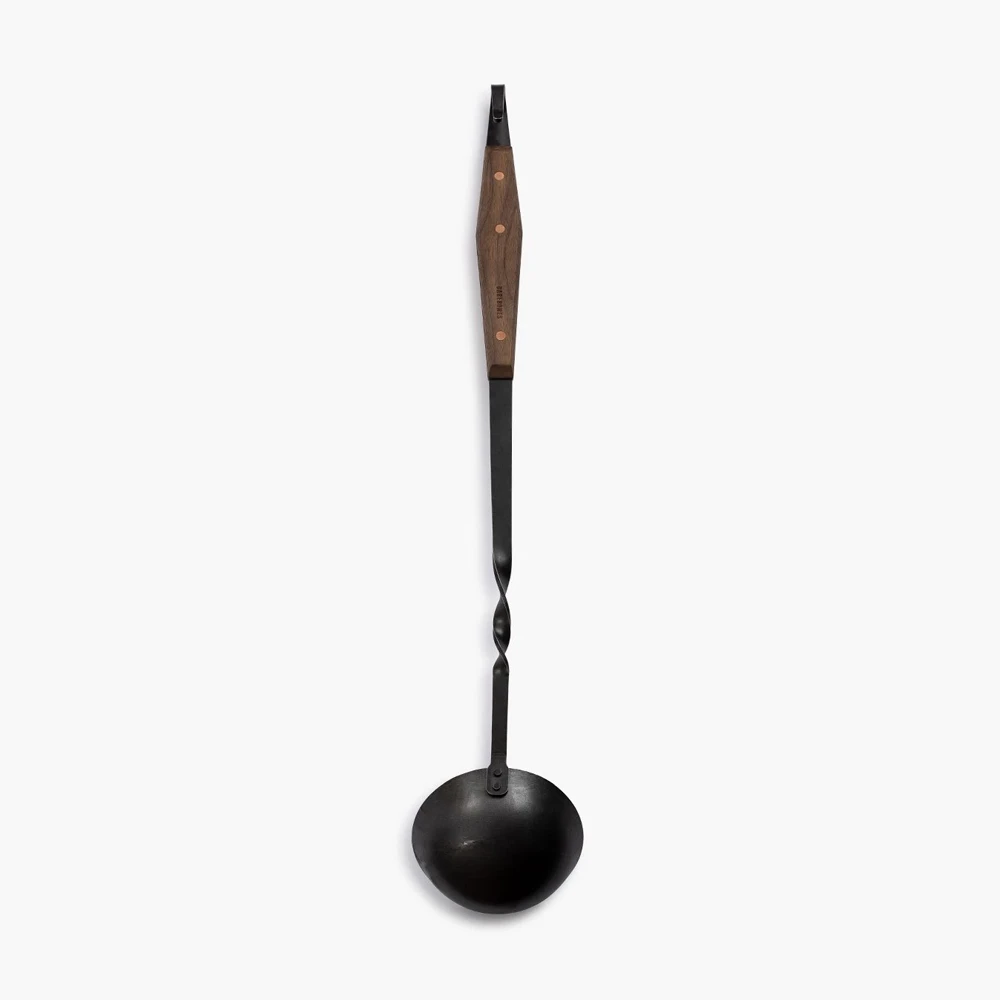 Pour sauces, soups, and stews. Designed to hang and work with our Cowboy Fire Pit Grill, this ladle is crafted with hand-forged stainless steel and fitted with a smooth, natural walnut handle that keeps cool over high heat. Longer than normal length allows for comfort and safety when working around fire and hot coals.
