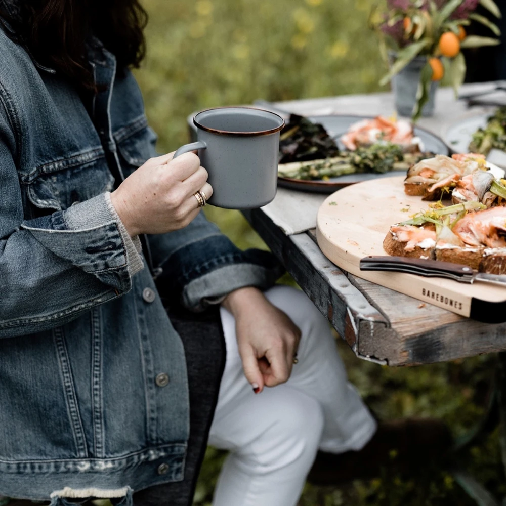 Complete your place settings with the Enamel Cup Set. Highlighted by a copper rim, a cup of coffee never looked so inviting. Each item features a hand-finished baked stainless steel trim creating a copper-like patina finish, resulting in unique pieces that form a cohesive set.