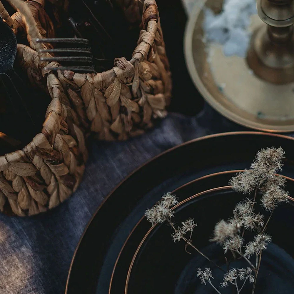 The curved edges of the Enamel Deep Plates are both design-forward and useful, keeping rich sauces and sweet compotes in the dish and off your table. Each item features a hand-finished baked stainless steel trim creating a copper-like patina finish, resulting in unique pieces that form a cohesive set.