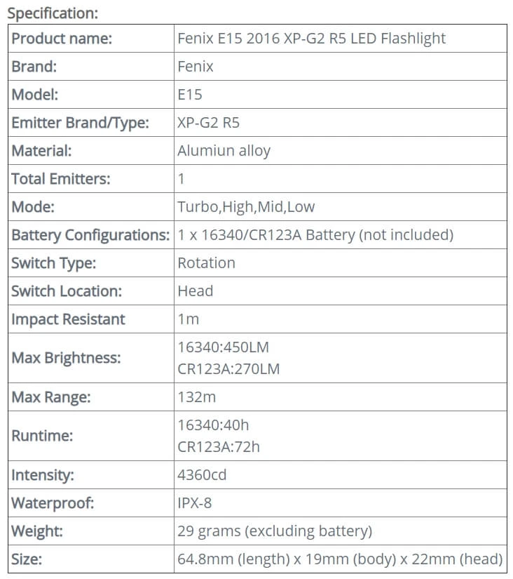 From the appearance, Fenix E15 (2016) is just a keychain-sized flashlight. While, its high performance will surely surprise you, the intelligent drive circuit boosts max 450 lumens from one 16340 Li-ion battery and also ensures the compatibility with the CR123A. With a twisty head switch, four output levels are available to meet your various lighting demands in daily use, hiking, searching and more.