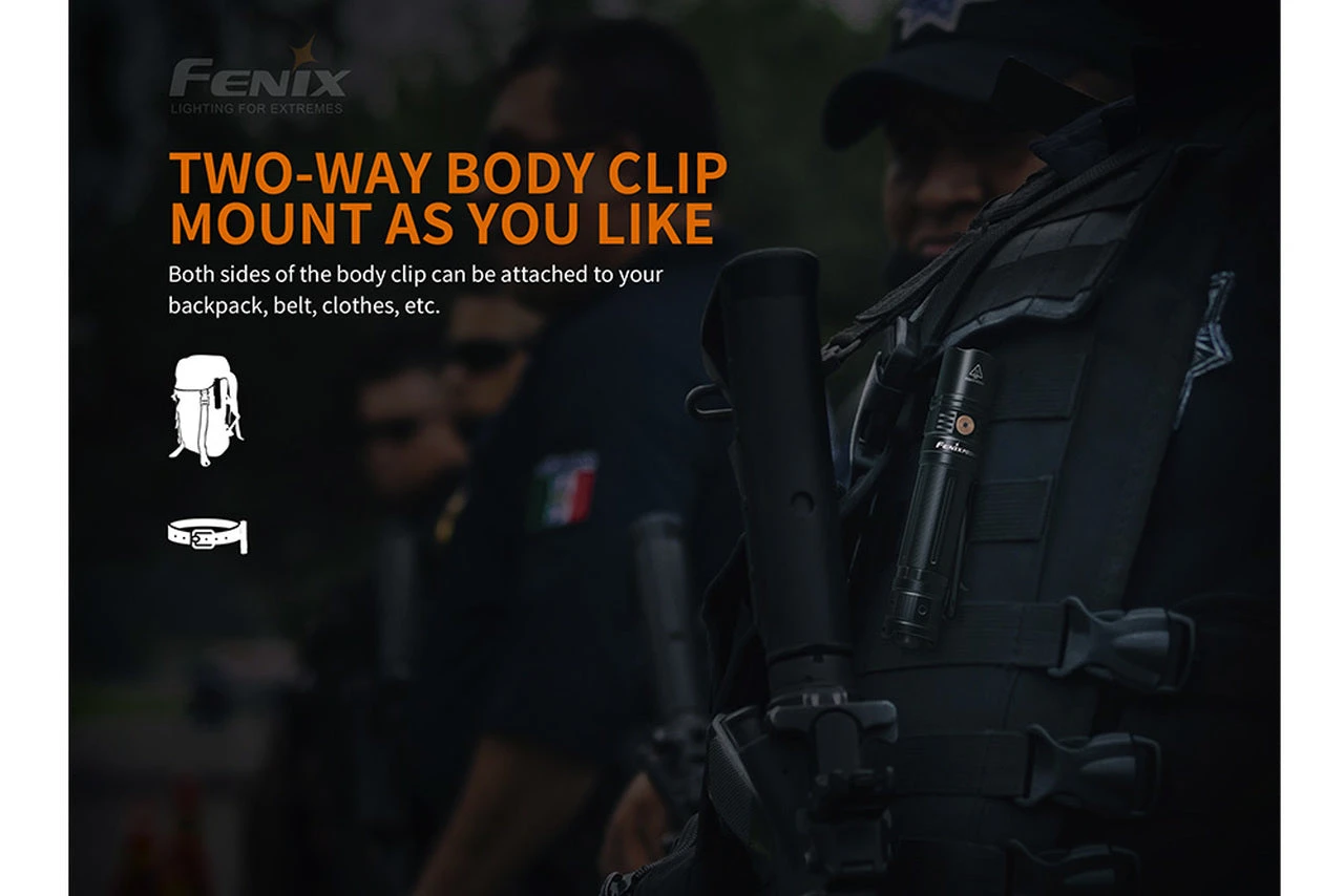 Designed for tactical applications, the Fenix PD36R Tactical Flashlight has an assortment of different features, including a max output of 1600 Lumens on the turbo setting which casts beam distance of 928 feet. Size wise, the light is only 5.35 inches in length and 1.04 inches in diameter. Made with a high-strength aluminum, this powerful flashlight can handle the elements and a drop or two of 1.5 meters on all sides. To protect all that functionality, the Fenix PD36R has been IP68 rated, allowing it to withstand being underwater up to 6.5 feet for 30 minutes. A quick tap of the PD36R’s rear tactical switch will instantly activate the flashlight, while a full press will leave the flashlight light on. Do you need more power? No need to worry; Fenix has integrated an all-new ARB-L21-5000 mAh rechargeable battery with Fenix PD36R that lasts longer than the typical 18650 battery. This new battery can be quickly charged with the included USB Type-C charging cable that plugs right into the flashlights charging port. Battery status can be seen on the flashlights side switch which lets you know when it’s time to charge your torch. Carrying the PD36R is a breeze with the innovative two-way body clip that attaches to backpacks, belts, and clothes alike. Upon purchasing the Fenix PD36R Tactical rechargeable flashlight, you will receive a durable holster, lanyard, O-ring, battery, charging cable and user manual.