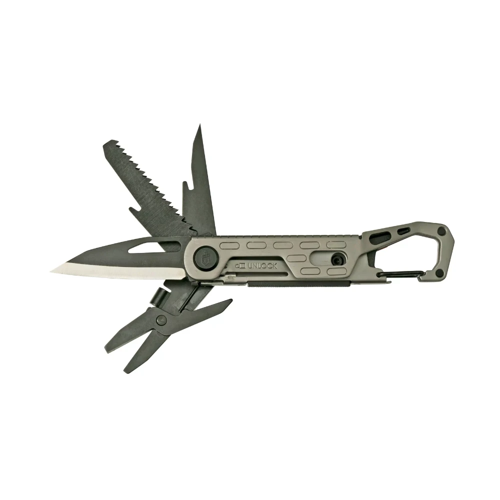 - Tools: awl, bottle opener, file, multi-purpose hook, knife, saw, scissors, scraper, tweezers, ruler, carabiner