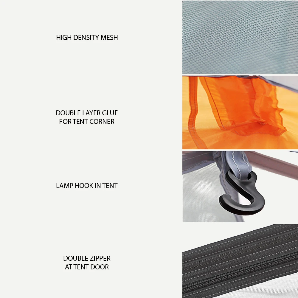- Outer tent material: 210T tear-resistant polyester fabric; PU coated waterproof 4000mm