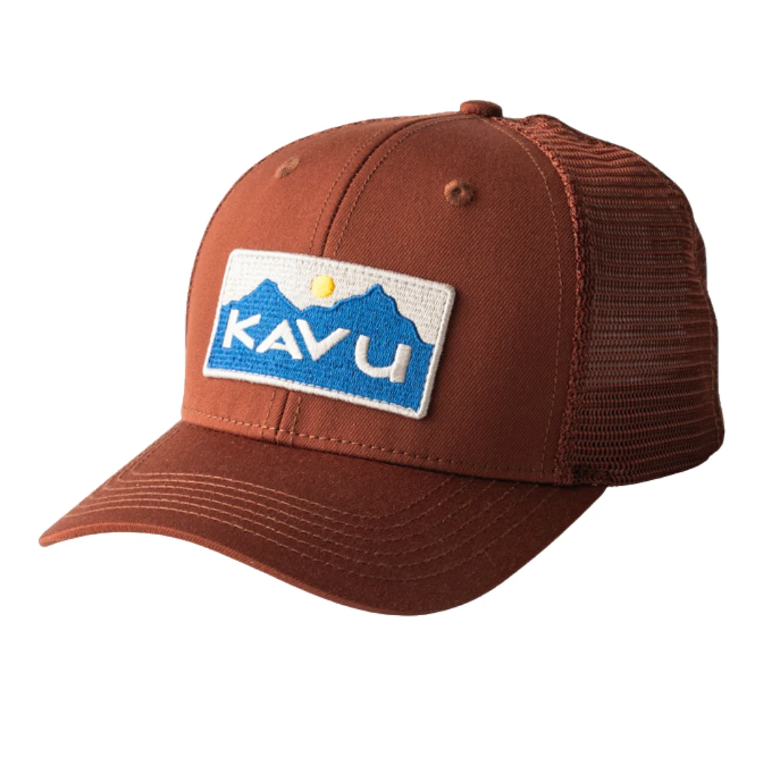 6 panel structured trucker hat, embroidered patch on front, embroidered eyelets, slight curved bill, soft liable mesh back with adjustable snap closure, buckram lined interior front panels, interior taping and moisture absorbing sweatband.