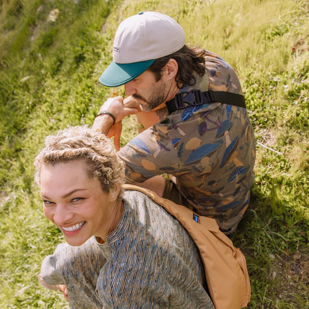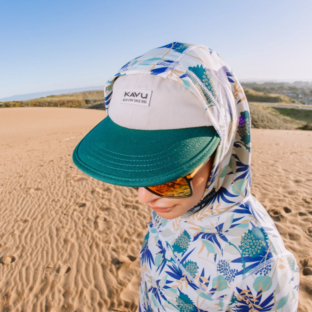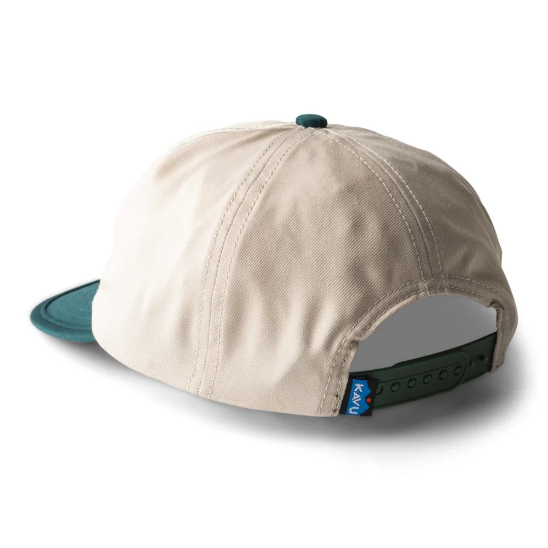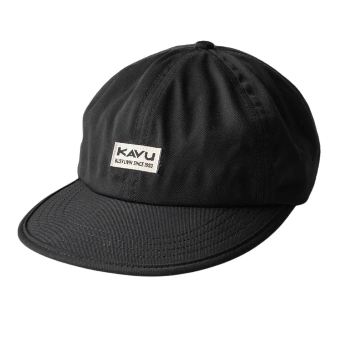 6 panel unstructured / low profile cap, KAVU logo label on front, soft foam bill, snap back closure, interior taping and moisture absorbing sweatband.