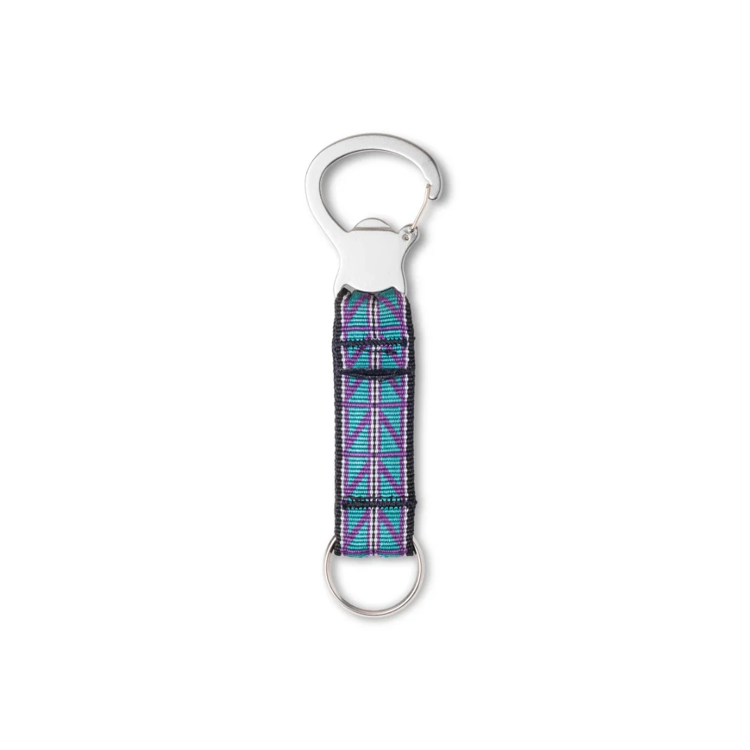 - 1″ wide patterned tubular webbing key chain with aluminum bottle opener carabiner.