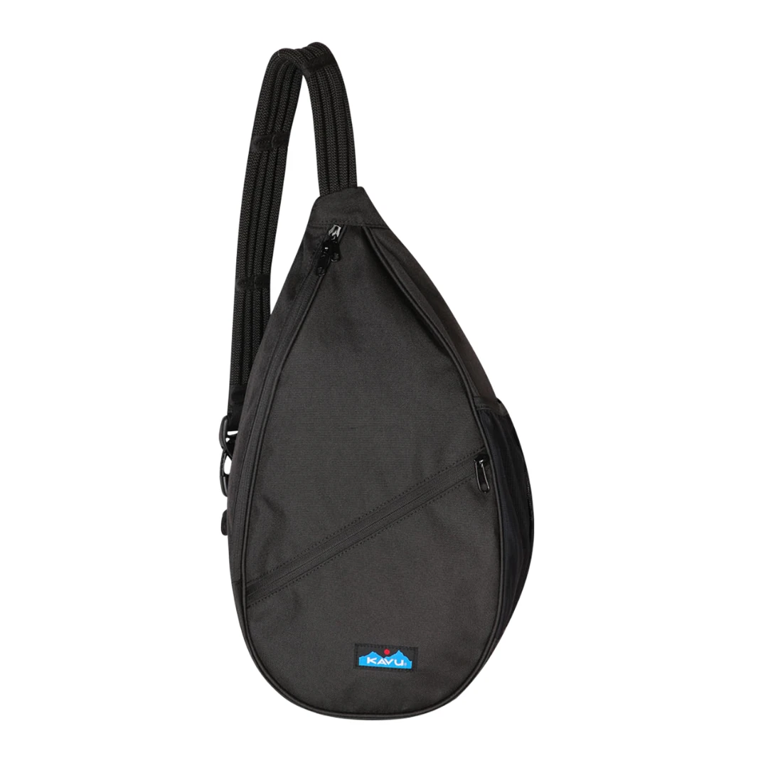 Adjustable rope shoulder strap and side release buckle, main compartment with zip closure, exterior mesh pocket, external and internal zip pockets, key clip and padded back with KAVU embroidery.