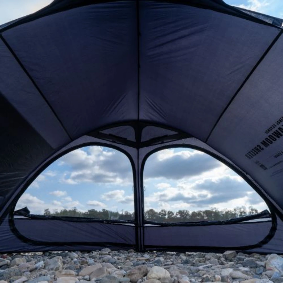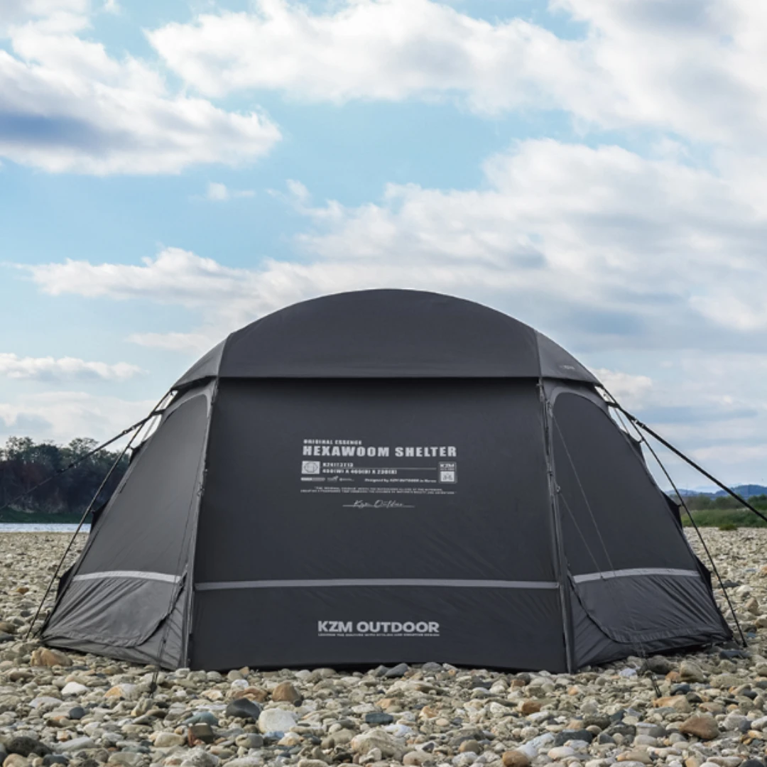 It provides a new and stable living space with a hexagonal design rather than a regular hexagon. It provides a wide sense of openness and a wide field of vision with the 4 doors opening in the front and back, and it can be stood up with just three poles. A roof with increased light blocking power and water pressure allows for comfortable camping. The exclusive flag of Hexaum Shelter highlights the unique style of Hexaum Shelter. In addition, you can secure a wide field of vision by purchasing the Hexaum Shelter exclusive double TPU product separately.