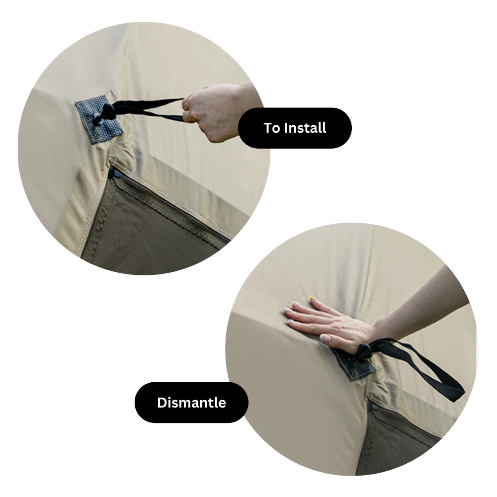 It is a shade tent that can be installed quickly and easily by pulling the handles located on both sides of the tent without assembly. The bottom of the inner tent and front/rear mesh windows are applied to provide excellent ventilation, providing a comfortable interior space at all times. It is a shade tent that allows for smooth outdoor activities by providing ample space for a comfortable rest.