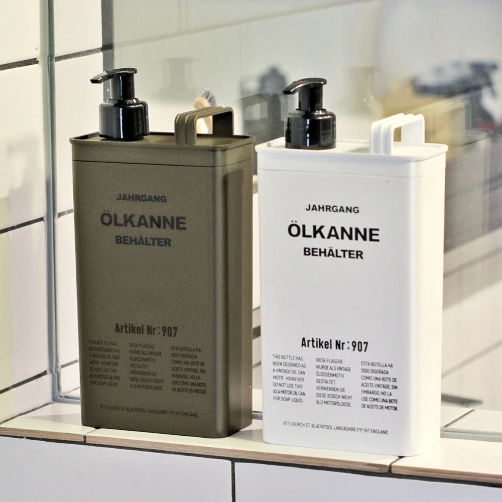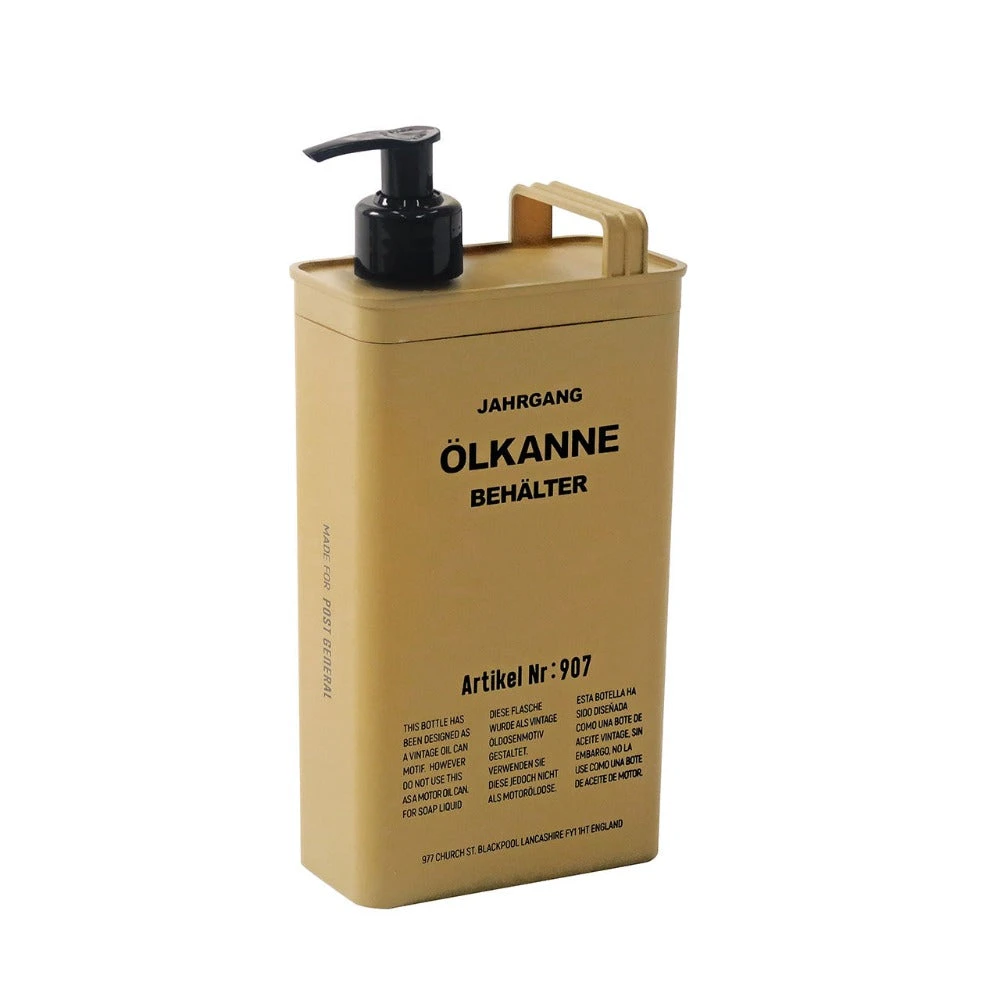 - A dispenser bottle designed with a vintage motor oil can as a motif