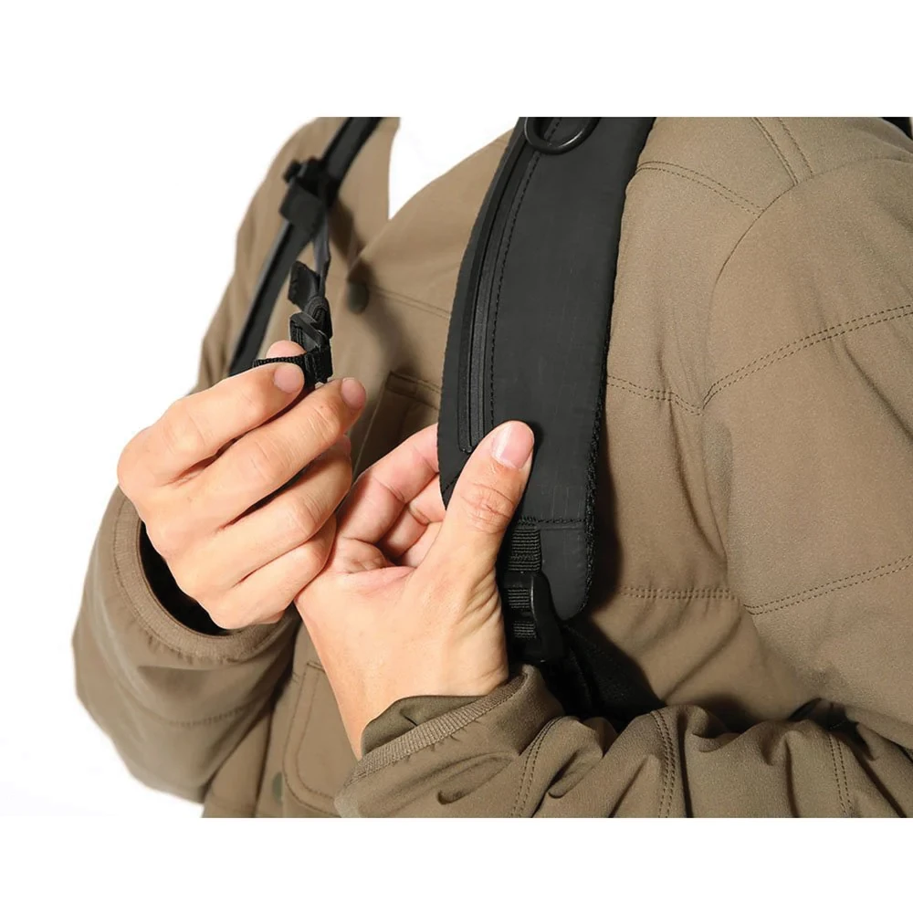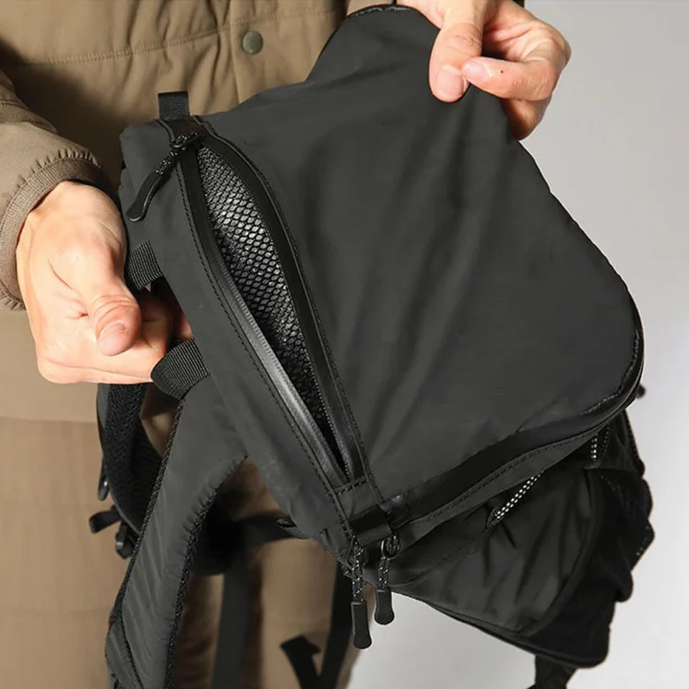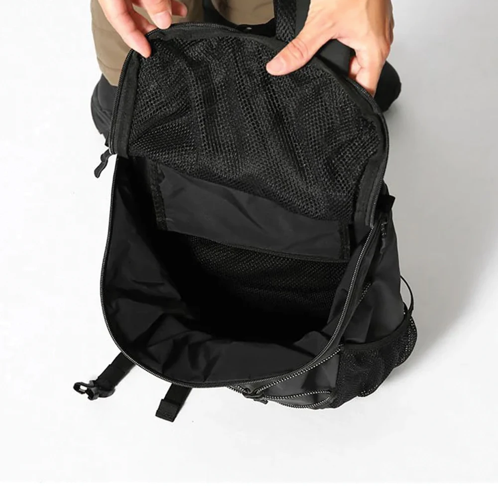 The Field Backpack L is a large pack intended for backpacking. The backpack is made of carbonate-coated 100% nylon. The Field Backpack L’s main compartment can be accessed from the zipper top and the front buckle. The pack also features a top cover, two zippered pockets, three zippered front pockets, mesh side pockets, shoe storage at the bottom of the backpack, a small internal pocket, and laptop pocket. Approximately 60L.