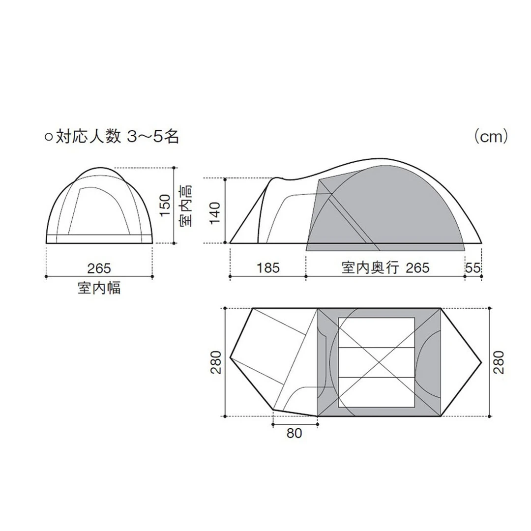 - Materials: Fly sheet/210g/㎡ polyester cotton blend fabric (approx. 65% polyester, approx. 35% cotton), Water repellent, Mold resistant, inner wall/68D polyester taffeta, bottom/210D polyester oxford, PU coating, Water pressure resistance 1,800mm minimum, frame/duralumin A7001 (Φ12.8mm, Φ12mm, Φ11.8mm)