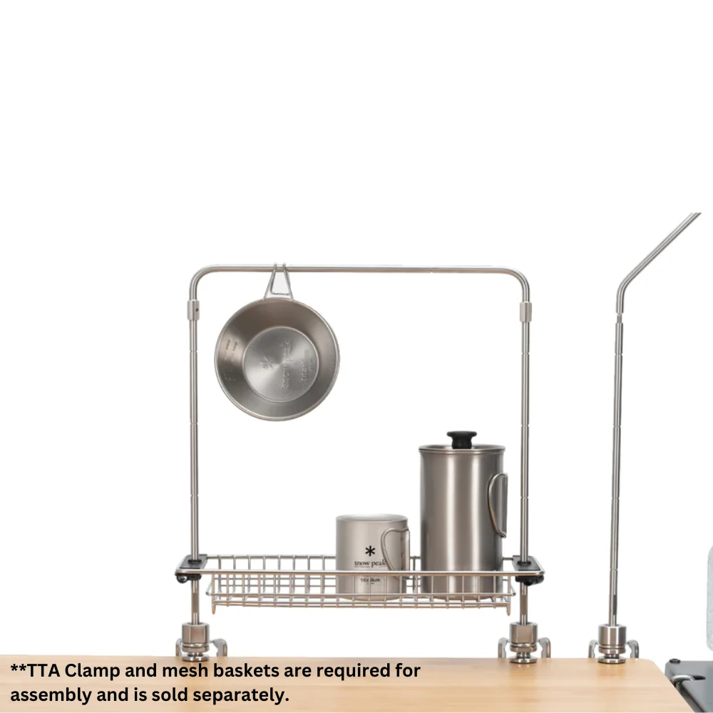 The TTA (Table Top Architect) Unit Frame is a component of the IGT system and TTA series that can be used as a shelf for storage. Kitchen tools can be hung on the frame, and it is compatible with the Shallow Mesh Tray Half Unit and Deep Mesh Tray Half Unit for additional storage and organizing. To use, connect the frame ends into two TTA Clamp Tools and adjust the tension.