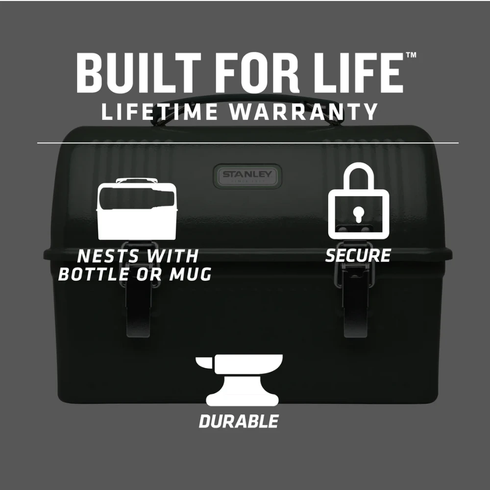 As far as vintage lunch boxes go, this one’s a real classic. Timeless design. Durable construction. And enough room to hold all your food (lunch, snack, second snack and more). There’s even a metal bracket just inside the lid that can keep your full-size Stanley Vacuum Bottle or Mug secure.
